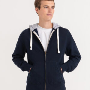 Full zip hoodie. Side panels for stylish fit. Brass zip covered with chunky rib detail. Overlock stitching detail throughout. Double fabric hood with heather grey waffle fabric inner. Chunky white flat lace drawcord. Kangaroo pouch pocket. Deep ribbed cuff and hem. Soft cotton faced fabric creates ideal printing surface.
