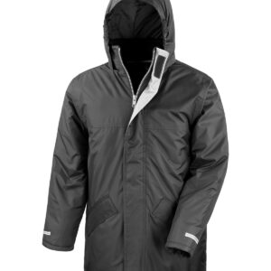 Waterproof-StormDri 2000. Windproof. Fully taped waterproof seams. Long fit. Super warm. Concealed 3-panel hood in collar. Full front heavy duty zip. 2 concealed front pockets with storm cover. Super warm fleece-lined collar. Reflective cuff and back detail. Name and class tag inside left pocket. Fleece-lined front pockets. Adjustable drawcord hem. Ready to brand cut away label. Oeko-Tex certified. Decorating methods: Embroidery, direct print, digital transfer print and screen print transfer. Decorators access point: Full hem and left chest.