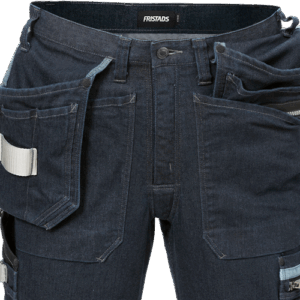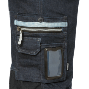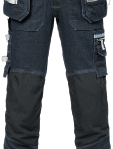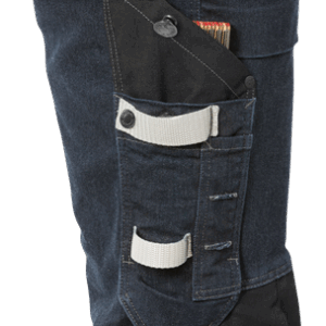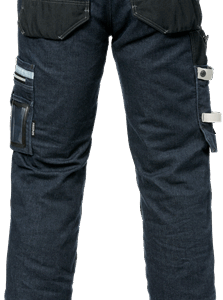 CORDURA® denim 4-way stretch / 2 CORDURA®-reinforced loose-hanging pockets, one with 3 smaller pockets and tool loop, the other with zip pocket / 2 bellowed front pockets / 2 CORDURA®-reinforced back pockets with loose bottom, one with flap and velcro fastening / D-ring under loose-hanging pocket / Hammer loop / Zip fly / Double reinforced crotch seam / CORDURA®-reinforced folding rule pocket with tool pocket, pen pocket, button and loop for sheath knife / Multifunction leg pocket with phone pocket, ID-card pocket, zip pocket and large pocket with snap fastening / Pre-shaped knees / CORDURA®-reinforced knee pockets with inside opening / Height adjustment for knee pads in knee pocket / CORDURA®-reinforced leg end, adjustable with snap fastening / Reflective piping at leg ends / Pockets reinforced with metallic rivets at stress points / Contrast seams / Approved according to EN 14404 together with kneepad art no 124292 / OEKO-TEX® certified.