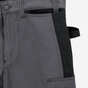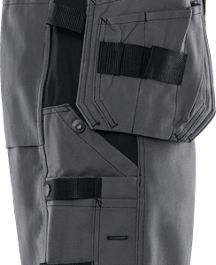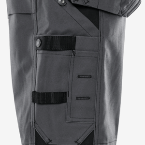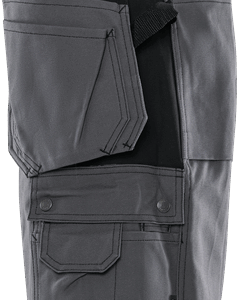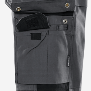 2 CORDURA®-reinforced loose-hanging, tuckable front pockets, one with extra pocket, the other with 3 small pockets and tool loops / D-ring / 2 hammer loops / 2 side pockets / 2 large back pockets / Folding rule pocket with pen pocket, pocket for tools or extra sheath knife, 2 knife buttons and loop / Leg pocket with snap fastening, phone pocket and extra pocket with loop for ID-card holder / Inside leg length 25 cm / OEKO-TEX® certified.