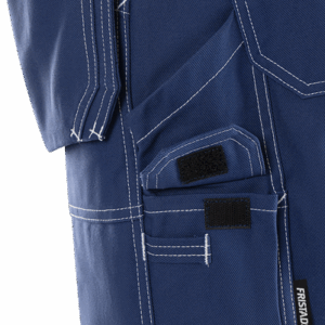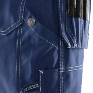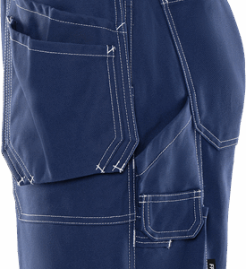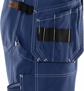 2 tuckable, CORDURA®-reinforced loose-hanging pockets, one with 3 small pockets and tool pocket, the other with extra pocket / 2 front and back pockets / D-ring / Hammer loop / 2 folding rule pockets, one with pen pocket and button and loop for sheath knife, the other with mobile phone pocket and loop for ID-card holder / Inside leg length 20 cm / OEKO-TEX® certified.