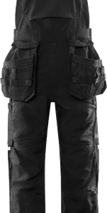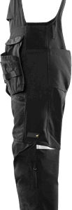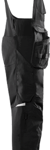 Partly recycled and bio-based material / 4-way stretch material / Adjustable elasticated braces / Large chest pocket with zip and ventilating mesh inside / Inside mobile phone pocket / Rib-knit stretch panels at waist and belt loops / 2 detachable loose-hanging pockets in CORDURA®, both with 3 smaller pockets and tool loops – pockets are detachable with concealed zip and snap fastening / 2 front pockets / 2 back pockets / Zip fly / Double reinforced crotch seam / CORDURA®-reinforcement on front thighs / Thigh pocket with zip and ventilating mesh inside / CORDURA® folding rule pocket with tool pocket and pen pocket / Pre-shaped knee / CORDURA®-reinforced knee pockets with outside opening / Possibility to adjust the height of the knee pad / Zippers on both sides of the knees for ventilation / CORDURA®-reinforced leg end, adjustable with snap fastening / Front leg ends are slightly extended / Reflective details on back and front legs / Approved according to EN 14404 together with knee pads 132082, 124292 / OEKO-TEX® certified.