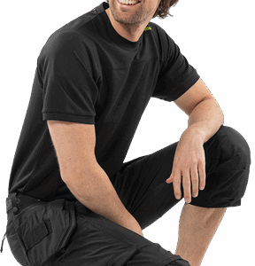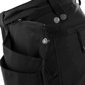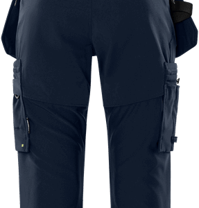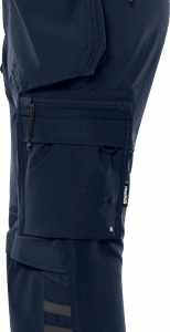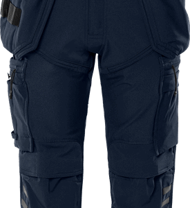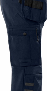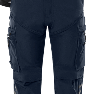 Partly recycled material / Lightweight 4-way stretch fabric / Durable ripstop 4-way stretch panels at upper front and back / Elastic waist at sides / 2 loose-hanging reinforced pockets, one with 3 smaller pockets and tool loops, one with extra pocket / Loose-hanging pockets are detachable with concealed zip / Concealed front button / 2 front pockets / 2 back pockets with zip / Double reinforced crotch seam / Hammer loop / Folding rule pocket in ripstop stretch, leg pocket with snap fastening, pocket with zip, pen pocket, 2 tool pockets and button and loop for sheath knife / Leg pocket with snap fastener, pocket with zip, mobile phone pocket and ID card pocket with flap, D-ring under flap / Ripstop stretch knee pockets with outside opening from above with velcro fastening / Height adjustment for knee pads in knee pockets / Reflective details at knees / Approved according to EN 14404 together with kneepads 124292 / OEKO-TEX® certified.