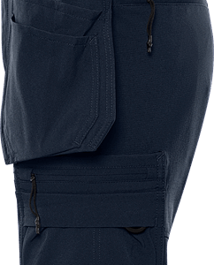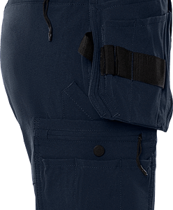 Partly recycled material / Lightweight 4-way stretch / Durable ripstop 4-way stretch panels at upper front and back / Elastic waist at sides / 2 loose-hanging reinforced pockets, one with 3 smaller pockets and tool loops, one with extra pocket / Loose-hanging pockets are detachable with concealed zip / Concealed front button / 2 front pockets / 2 back pockets with zip / Double reinforced crotch seam / Hammer loop / Folding rule pocket in ripstop stretch, leg pocket with snap fastening, pocket with zip, pen pocket, 2 tool pockets and button and loop for sheath knife / Leg pocket with snap fastener, pocket with zip, mobile phone pocket and ID card pocket with flap, D-ring under flap / OEKO-TEX® certified.