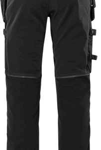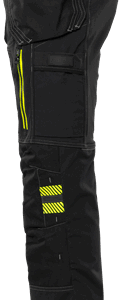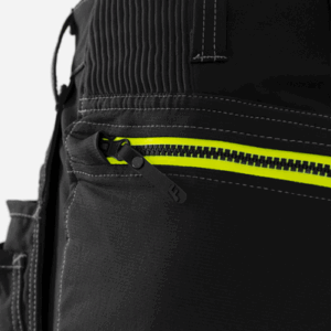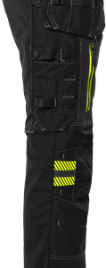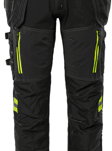 Partly recycled and biobased material / 4-way stretch materials / Thigh panels and back part of durable 4-way ripstop stretch material / Stretch rib insets at waist / 2 loose-hanging CORDURA® pockets, one with 3 smaller pockets, tool loops and zip pocket, one with extra pocket and zip pocket / D-ring under loose hanging pocket / 2 front pockets / 2 back pockets with zip / Hammer loop / Double reinforced crotch seam / 2 thigh pockets with zip and ventilation panels inside / Folding rule pocket in CORDURA® with tool pocket, pen pocket, button and loop for sheath knife / Leg pocket with mobile phone pocket and folding rule pocket / CORDURA® reinforced knee pockets with inside opening / Height adjustment for knee pads in knee pocket / CORDURA® reinforced leg end, adjustable with snap fastening / Approved according to EN 14404 together with kneepads 124292 / OEKO-TEX® certified.