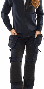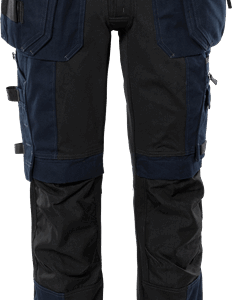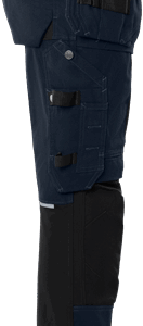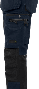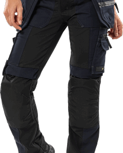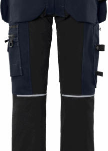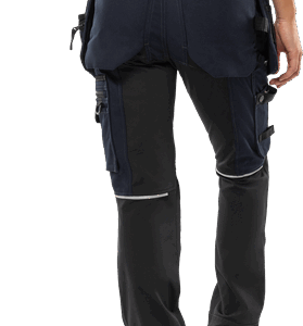 Large 4-way stretch panels at front, back and legs / 2 CORDURA®-reinforced loose-hanging pockets, one with 2 pockets whereof one with zip, one with 3 smaller pockets and tool loops / 2 front pockets / 2 side pockets, one with zip / 2 CORDURA®-reinforced back pockets with loose bottom / D-ring under loose-hanging pocket / Double reinforced crotch seam / Hammer loop / CORDURA®-reinforced folding rule pocket with tool pocket, pen pocket, button and loop for sheath knife / Large leg pocket with snap fastening, waterproof zip pocket, phone pocket and extra pocket with D-ring for id-card holder / CORDURA®-reinforced knee pockets with outside opening from above / Height adjustment for knee pads in knee pocket / CORDURA®-reinforced leg end, adjustable with snap fastening / Reflective details at back of legs / Approved according to EN 14404 together with kneepads 124292 / OEKO-TEX® certified.