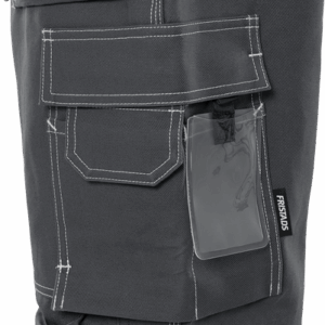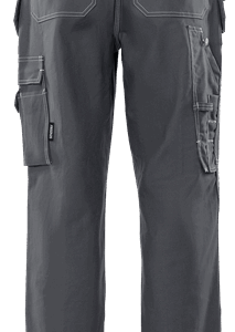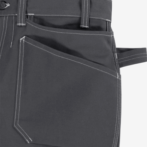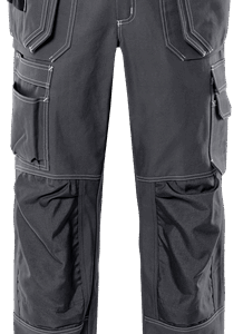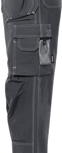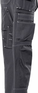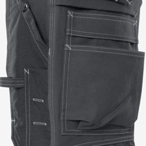 2 tuckable, CORDURA®-reinforced loose-hanging pockets, one with 3 small pockets and tool loops, the other with extra pocket / 2 large front and back pockets / 2 hammer loops, one adjustable / CORDURA® folding rule pocket with pen pocket and button and loop for sheath knife / Leg pocket with flap, phone pocket and extra pocket with loop for attached ID-card holder / Pocket for floor layers knife / CORDURA®-reinforced knee pockets with outside opening / Height adjustment for knee pads in knee pocket / Approved according to EN 14404 together with kneepads 124292 / OEKO-TEX® certified.