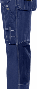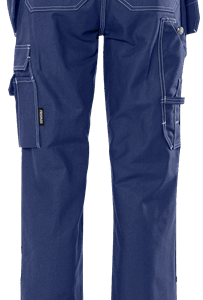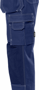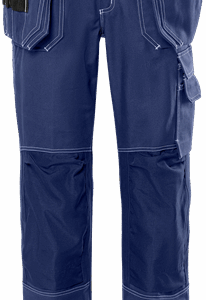 2 tuckable, CORDURA®-reinforced loose-hanging pockets, one with 3 small pockets and tool loops, the other with extra pocket / 2 large front and back pockets / D-ring / 2 hammer loops, one adjustable / CORDURA® folding rule pocket with pen pocket and button and loop for sheath knife / Leg pocket with flap, phone pocket and extra pocket with loop for attached ID-card holder / CORDURA®-reinforced knee pockets with outside opening / Height adjustment for knee pads in knee pocket / Approved according to EN 14404 together with kneepads 124292 / OEKO-TEX® certified.