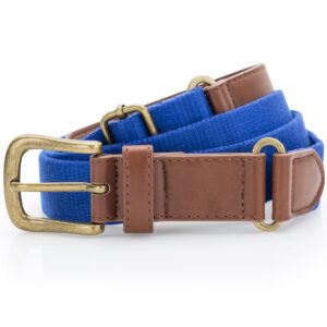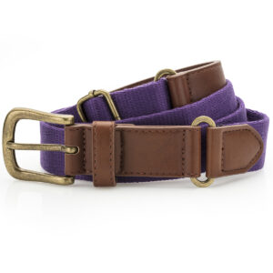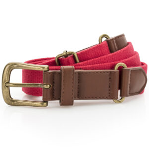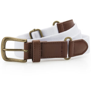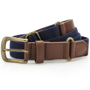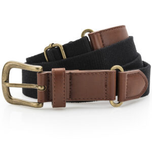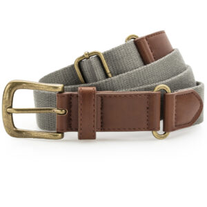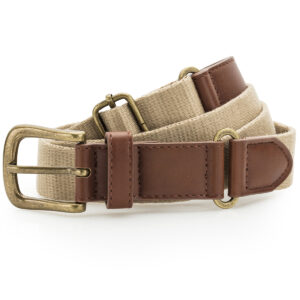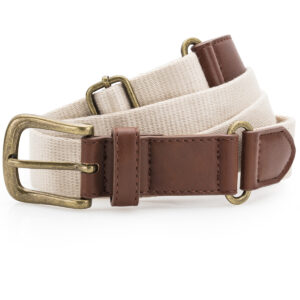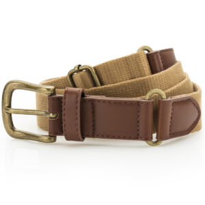 Canvas and faux leather belt. Belt strap and buckle are faux leather. 3 holes for belt buckle. Adjustable length. Product contains no branded neck label. Removable Kimble or looped garment tags. Inner seam label holds important product information on one label with a second label containing brand information which can be cut-away. Please note old stock may contain a fixed branded label.