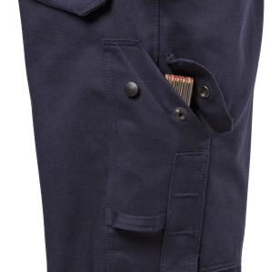Front placket opening with 2-way zip to top of collar and concealed snap fastening / 2 bellowed chest pockets with flap and concealed snap fastening, 1 with inside D-ring / Inside pocket with button fastening and mobile phone pocket with flap and velcro fastening / Adjustable waist with elasticated band and button / Adjustable cuffs with snap fastening / Double reinforced crotch seam / 2 front pockets / 2 CORDURA® reinforced back pockets with flap and concealed snap fastening / CORDURA® reinforced folding rule pocket with flap and concealed snap fastening and button and loop for sheath knife / Leg pocket with flap and concealed snap fastening, mobile phone pocket with flap and velcro fastening and D-ring / Hammer loop / CORDURA® reinforced knee pockets with inside opening / Height adjustment for knee pads in knee pocket / CORDURA®-reinforced leg ends / Approved according to EN 61482-1-2 APC 1, EN 61482-1-1 ELIM: 8 cal/cm² (see Electric arc table for certified garment combinations for EN 61482-1-2 class 2 and open arc according to EN 61482-1-1), EN ISO 11612 A1 B1 C1 E2 F1, EN ISO 11611 A1 class 1 (see Flame and welding table for certified garment combinations), EN 1149-5, EN ISO 20471 class 3 and EN 14404 together with kneepads 124292 / Approved after 50 washes / Leasing laundry-tested according to ISO 15797 / OEKO-TEX® certified.
