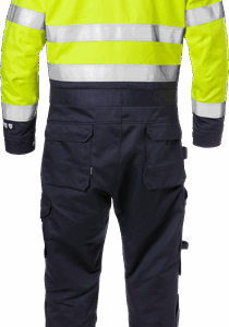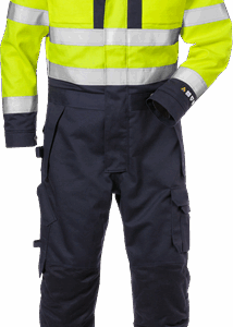 Fully lined / Front placket opening with 2-way zip to top of collar and concealed snap fastening / 2 bellowed chest pockets with flap and concealed snap fastening, one with inside D-ring / Microphone holder on left front side / Inside pocket with button fastening and mobile phone pocket with flap and velcro fastening / Adjustable waist with drawstring / Adjustable sleeve end with snap fastening / Rib-knitted cuff / Front pockets with flap, snap fastening and zip / 2 CORDURA® reinforced back pockets with flap and snap fastening / Hammer loop / Double reinforced crotch seam / CORDURA® reinforced folding rule pocket with flap and snap fastening, button and loop for sheath knife / Leg pocket with flap and concealed snap fastening, phone pocket with flap and velcro fastening / CORDURA® reinforced knee pockets with inside opening / Height adjustment for knee pads in knee pocket / Concealed zip up to knees / Snow gaiters / Adjustable, CORDURA® reinforced leg ends / Approved according to EN 61482-1-2 APC 2, EN 61482-1-1 ELIM: 43 cal/cm² ATPV: 48 cal/cm², EN ISO 11612 A1 B1 C1 E2 F1, EN ISO 11611 A1 class 1, EN 1149-5, EN ISO 20471 class 3, EN 342 and EN 14404 together with kneepads 124292 / Outer material certified after 50 washes / Leasing laundry-tested according to ISO 15797 / OEKO-TEX® certified.