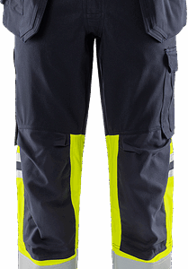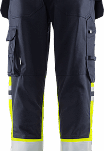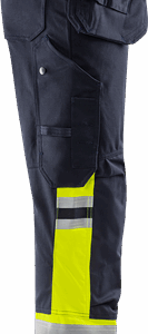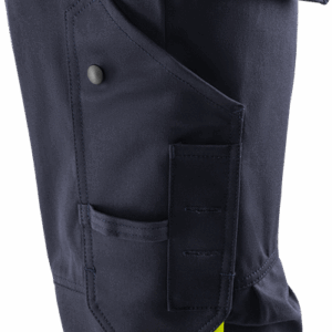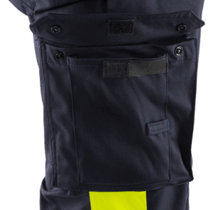 Stretch material / Dirt, oil and water repellent / Concealed front button / 2 reinforced loose-hanging pockets, one with 3 small pockets and tool loops and one with extra pocket / 2 front pockets / 2 reinforced back pockets / Hammer loop / Double reinforced crotch seam / Reinforced pocket for folding rule and tools with pen pocket and button and loop for sheath knife / Leg pocket with flap and concealed snap fastening, mobile phone pocket and loop for ID card holder / Reinforced knee pockets with inside opening / Height adjustement for knee pads in knee pocket / Metal free / Approved according to EN 61482-1-2 APC 1, EN 61482-1-1 ELIM: 8 cal/cm² (included in electric arc certified garment combinations), EN ISO 11612 A1 B1 C1 F1, EN 1149-5, EN ISO 20471 class 1 and EN 14404 together with kneepads 124292 / Fabric is approved according to EN 13034 / Certified after 50 washes / Leasing laundry-tested according to ISO 15797 / OEKO-TEX® certified.