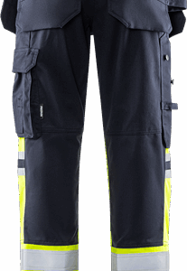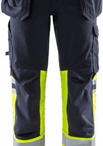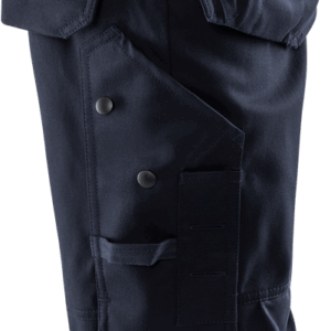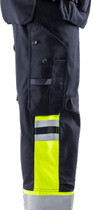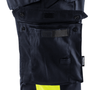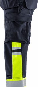 Stretch material / Dirt, oil and water repellent / Concealed front button / 2 reinforced loose-hanging pockets, one with 3 small pockets and tool loops and one with extra pocket / 2 front pockets / 2 reinforced back pockets / Hammer loop / Double reinforced crotch seam / Reinforced pocket for folding rule and tools with pen pocket and button and loop for sheath knife / Leg pocket with flap and concealed snap fastening, mobile phone pocket, loop for ID card holder and folding rule pocket / Reinforced knee pockets with inside opening / Height adjustement for knee pads in knee pocket / Metal free / Approved according to EN 61482-1-2 APC 1, EN 61482-1-1 ELIM: 8 cal/cm² (included in electric arc certified garment combinations), EN ISO 11612 A1 B1 C1 F1, EN 1149-5, EN ISO 20471 class 1 and EN 14404 together with kneepads 124292 / Fabric is approved according to EN 13034 / Certified after 50 washes / Leasing laundry-tested according to ISO 15797 / OEKO-TEX® certified.