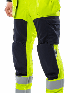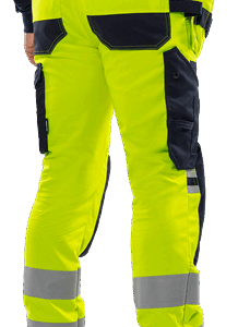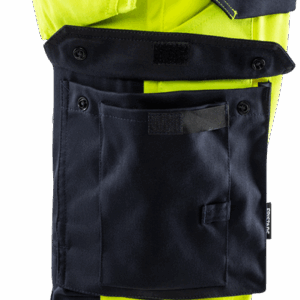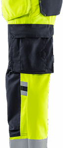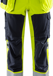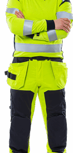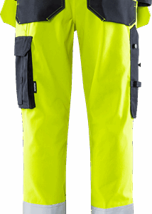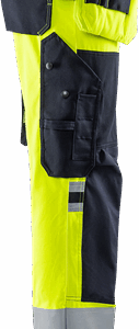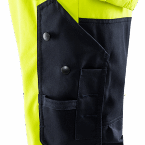 Stretch material / Dirt, oil and water repellent / Concealed front button / 2 reinforced loose-hanging pockets, one with 3 small pockets and tool loops and one with extra pocket / 2 front pockets / 2 reinforced back pockets / Hammer loop / Double reinforced crotch seam / Reinforced pocket for folding rule and tools with pen pocket and button and loop for sheath knife / Leg pocket with flap and concealed snap fastening, mobile phone pocket, loop for ID card holder and folding rule pocket / Reinforced knee pockets with inside opening / Height adjustement for knee pads in knee pocket / Metal free / Approved according to EN 61482-1-2 APC 1, EN 61482-1-1 ELIM: 8 cal/cm² (included in electric arc certified garment combinations), EN ISO 11612 A1 B1 C1 F1, EN 1149-5, EN ISO 20471 class 2 and EN 14404 together with kneepads 124292 / Fabric is approved according to EN 13034 / Certified after 50 washes / Leasing laundry-tested according to ISO 15797 / OEKO-TEX® certified.