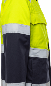 Dirt, oil and water repellent / Reflective detailing on shoulders / Front placket opening with zip to top of collar and concealed snap fastening / 2 bellowed chest pockets with flap and concealed snap fastening, one with inside D-ring and pen strap and one with opening for radio-antenna at top / Microphone holder / Chest pocket with zip / 2 front pockets with zip / Inside pocket with button / Inside phone pocket with velcro fastening and loop for mobile phone earpiece / Adjustable waist and cuffs / Extended back / Approved according to EN 61482-1-2 APC 1, EN 61482-1-1 ELIM: 9 cal/cm² (see Electric arc table for certified garment combinations for EN 61482-1-2 class 2 and open arc according to EN 61482-1-1), EN ISO 11612 A1 A2 B1 C1 E2 F1, EN ISO 11611 A1 A2 class 1 (see Flame and welding table for certified garment combinations), EN 1149-5, EN 13034 Type PB [6] and EN ISO 20471 class 1 sizes XS-S, class 2 sizes M-3XL / Certified after 50 washes / Leasing laundry-tested according to ISO 15797 / OEKO-TEX® certified.