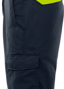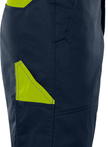 Partly recycled material / With Environmental Product Declaration (EPD) / Mechanical stretch / Rib-knit stretch panels at waist / Concealed front button / 2 front pockets / 2 back pockets / Folding rule pocket and tool pocket / Leg pocket with loop for id-card holder, flap with concealed snap fastening / Leasing-laundry tested according to ISO 15797 / OEKO-TEX® certified / EPD registration number 13208 at environdec.com