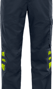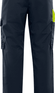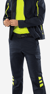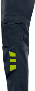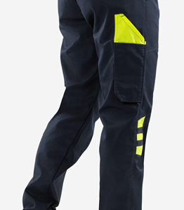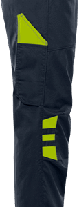 Partly recycled material / With Environmental Product Declaration (EPD) / Mechanical stretch / Rib-knit stretch panels at waist / Concealed front button / 2 front pockets / 2 back pockets / Folding rule pocket and tool pocket / Leg pocket with loop for id-card holder, flap with concealed snap fastening / Pre-shaped knees / Adjustable leg length with 5 cm hem allowance / Approved according to EN 13758-2 UPF 40+ UV protection / Leasing-laundry tested according to ISO 15797 / OEKO-TEX® certified / EPD registration number 13205 at environdec.com