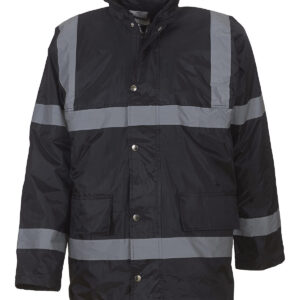 Fully waterproof & windproof security jacket with the enhanced visibility for safety. PU coated Nylon outer fabric with 190g quilted padding and Nylon lining. Heavy duty zip with studded storm flap. 2 outer pockets with over flaps. Elasticated Knitted storm cuffs in the sleeve ends. Step collar with a concealed integral hood. Inside breast pocket. Throughout stitched and taped seams to ensure waterproof. Matching trousers available, code HVS461.