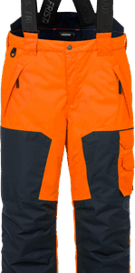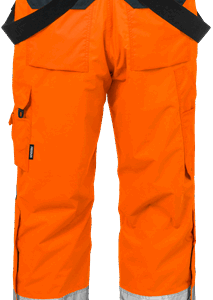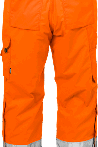 Airtech® breathable, wind and waterproof / Quilted lining / Detachable braces / Belt loops / Adjustable waist / D-ring / 2 front pockets with covered zip / 2 back pockets with flaps and velcro fastening / Folding rule pocket with extra pocket / Leg pocket with flap and velcro fastening, mobile phone pocket with flap and velcro fastening, D-ring and ID-card pocket / Pre-shaped knees / Knee pockets with inside opening / Height adjustment for knee pads in knee pocket / Reinforced thigh panel in contrast colour / Short zip at leg ends / Adjustable leg ends / Waterpillar 20,000 mm / Breathability Airtech® material RET <15 / Approved according to EN 14404 together with kneepads 124292, EN ISO 20471 class 2, EN 342 and EN 343 class 4/1. Shell fabric meets class 4 for water vapour permeability; EN 343 class 4/4 / Colour 271 is approved according to RIS-3279-TOM: 2019 Issue 2 UK Railway Standard / Certified after 25 washes / OEKO-TEX® certified.