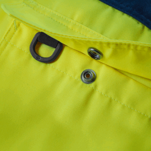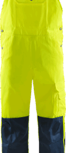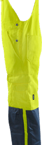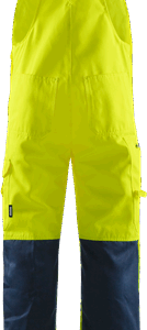 Adjustable elasticated braces / Bib pocket with flap and button / 2 side pockets / 2 back pockets / Waist opening with buttons / D-ring / Leg pocket with flap and velcro fastening, phone pocket with flap and velcro fastening / Folding rule pocket with pen pocket and button and loop for sheath knife / Knee pockets with outside opening / Height adjustment for knee pads in knee pockets / Approved according to EN 14404 together with kneepads 124292 and EN ISO 20471 class 2 / Certified after 25 washes / OEKO-TEX® certified.