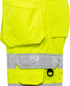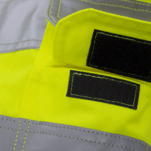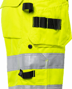 CORDURA® reinforced loose-hanging pockets, one with extra pocket and the other with 3 pockets and tool loops / 2 front pockets / 2 back pockets, one with flap and velcro fastening / D-ring at waistband / Double reinforced crotch seam / Hammer loop / CORDURA®-reinforced folding rule pocket with pen pocket, pocket for tools or extra sheath knife, 2 knife buttons and loop / Leg pocket with flap and velcro fastening, phone pocket and extra pocket with D-ring for id-card holder / Approved according to EN ISO 20471 class 1 in sizes C44-C50 and class 2 in sizes C52-C66 / Colour 230 in sizes C52-C66 is approved according to RIS-3279-TOM issue 2 UK Railway Standard / Certified after 50 washes / Leasing laundry-tested according to ISO 15797 / OEKO-TEX® certified.
