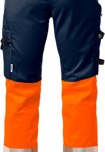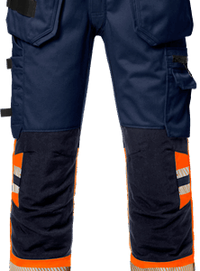 Stretch panels at sides, yoke and crotch / 2 CORDURA®-reinforced loose-hanging pockets, one with 3 smaller pockets and tool loops, the other with extra pocket / 2 side pockets / D-ring / 2 back pockets with zip / Double reinforced crotch seam / Hammer loop / Folding rule pocket with tool pocket, pen pocket, button and loop for sheath knife / Multifunction leg pocket with phone pocket, ID-card pocket and zip pocket / CORDURA®-reinforced knee pockets with inside opening / Height adjustment for knee pads in knee pocket / CORDURA®-reinforced leg end / Approved according to EN 14404 together with kneepads 124292 and EN ISO 20471 class 1 / Certified after 25 washes / With EPD (Environmental Product Declaration) – registration number 3882 at environdec.com / OEKO-TEX® certified.