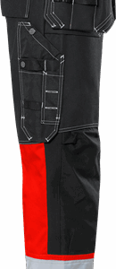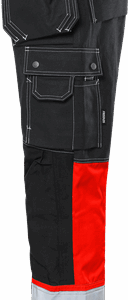 2 tuckable CORDURA®-reinforced loose-hanging front pockets, one with extra pocket, the other with 3 pockets and tool loops / 2 bellowed front and back pockets / 2 D-rings / 2 hammer loops / CORDURA® folding rule pocket with pen pocket, pocket for tools or extra sheath knife, 2 knife buttons and loop / Leg pocket with snap fastening, phone pocket and extra pocket with loop for ID-card holder / Pre-shaped knees / CORDURA®-reinforced knee pockets with inside opening / Height adjustment for knee pads in knee pocket / Approved according to EN 14404 together with kneepads 124292 and EN ISO 20471 class 1 / OEKO-TEX® certified.
