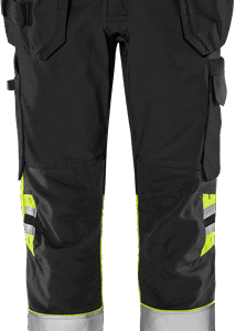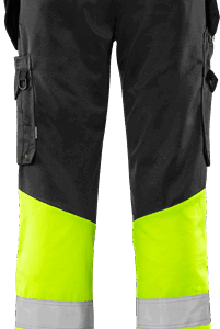 Recycled material and organic cotton / Rib-knit stretch panels at waist / Concealed front button / CORDURA®-reinforced loose-hanging front pockets, one with 3 small pockets and tool loops, the other with extra pocket / Loose-hanging pockets are detachable with concealed zip / 2 front pockets / 2 back pockets / Double reinforced crotch seam / Hammer loop / CORDURA®-reinforced folding rule pocket with tool pocket, pen pocket, button and loop for sheath knife / Leg pocket with snap fastening, pocket with flap and velcro fastening, D-ring / CORDURA®-reinforced knee pockets with inside opening / Height adjustment for knee pads in knee pocket / CORDURA®-reinforced leg end / Leg length can be lengthened by 5 cm or shortened by 3 cm / Approved according to EN ISO 20471 class 1, EN 14404 together with kneepads 124292 and EN 13758-2 UPF 40+ UV protection / Approved after 50 washes / Leasing-laundry tested according to ISO 15797 / OEKO-TEX® certified.