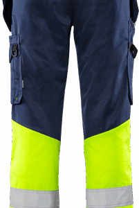 Recycled material and organic cotton / Rib-knit stretch panels at waist / Concealed front button / CORDURA®-reinforced loose-hanging front pockets, one with 3 small pockets and tool loops, the other with extra pocket / Loose-hanging pockets are detachable with concealed zip / 2 front pockets / 2 back pockets / Double reinforced crotch seam / Hammer loop / CORDURA®-reinforced folding rule pocket with tool pocket, pen pocket, button and loop for sheath knife / Leg pocket with snap fastening, pocket with flap and velcro fastening, D-ring / CORDURA®-reinforced knee pockets with inside opening / Height adjustment for knee pads in knee pocket / CORDURA®-reinforced leg end / Leg length can be lengthened by 5 cm or shortened by 3 cm / Approved according to EN ISO 20471 class 1, EN 14404 together with kneepads 124292 and EN 13758-2 UPF 40+ UV protection / Approved after 50 washes / Leasing-laundry tested according to ISO 15797 / OEKO-TEX® certified.