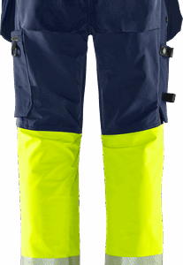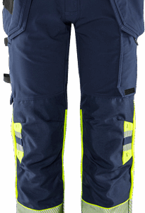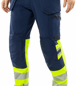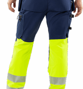 Part of Fristads Green collection / Sustainable / 4-way stretch fabric / Rib-knit stretch panels at waist / Durable ripstop 4-way stretch at seat and back of thighs / Concealed front button / CORDURA®-reinforced loose-hanging front pockets, one with zip pocket, 3 small pockets and tool loops, the other with extra pocket / D-ring under loose-hanging pocket / 2 front pockets / 2 bellowed back pockets, one with zip / Double reinforced crotch seam / Hammer loop / CORDURA®-reinforced folding rule pocket with tool pocket, pen pocket, buttons and loops for sheath knife / Leg pocket with snap fastening, zip pocket and D-ring / CORDURA®-reinforced knee pockets with inside opening / Height adjustment for knee pads in knee pocket / CORDURA®-reinforced leg end / Hidden boot hook / Approved according to ISO 20471 class 1, EN 14404 together with kneepads 124292 and EN 13758-2 UPF 40+ Solar UV Protective Properties / Certified after 50 washes / With EPD (Environmental Product Declaration) – registration number 3887 at environdec.com / OEKO-TEX® certified.