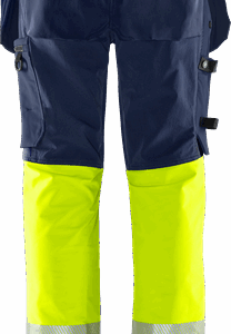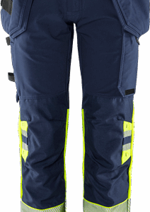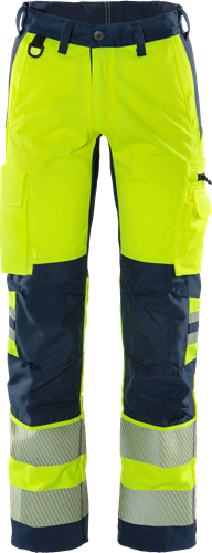 Part of Fristads Green collection / Sustainable / 4-way stretch fabric / Rib-knit stretch panels at waist / Durable ripstop 4-way stretch at seat and back of thighs / Concealed front button / CORDURA®-reinforced loose-hanging front pockets, one with zip pocket, 3 small pockets and tool loops, the other with extra pocket / D-ring under loose-hanging pocket / 2 front pockets / 2 bellowed back pockets, one with zip / Double reinforced crotch seam / Hammer loop / CORDURA®-reinforced folding rule pocket with tool pocket, pen pocket, buttons and loops for sheath knife / Leg pocket with snap fastening, zip pocket and D-ring / CORDURA®-reinforced knee pockets with inside opening / Height adjustment for knee pads in knee pocket / CORDURA®-reinforced leg end / Hidden boot hook / Approved according to ISO 20471 class 1, EN 14404 together with kneepads 124292 and EN 13758-2 UPF 40+ Solar UV Protective Properties / Approved after 50 washes / With EPD (Environmental Product Declaration) – registration number 4489 at environdec.com / OEKO-TEX® certified.