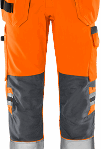 Part of Fristads Green collection / Sustainable / Rib-knit stretch panels at waist / Concealed front button / CORDURA®-reinforced loose-hanging front pockets, one with 3 small pockets and tool loops, the other with extra pocket / 2 front pockets / 2 back pockets / Double reinforced crotch seam / Hammer loop / CORDURA®-reinforced folding rule pocket with tool pocket, pen pocket, button and loop for sheath knife / Leg pocket with snap fastening, pocket with flap and velcro fastening, D-ring / CORDURA®-reinforced knee pockets with inside opening / Height adjustment for knee pads in knee pocket / CORDURA®-reinforced leg end / Leg length can be lengthened by 5 cm / Leg length can be shortened by 4 cm in sizes C44-C70, C146-C160 and 2 cm in D84-D136 / Approved according to EN ISO 20471 class 2, EN 14404 together with kneepads 124292 and EN 13758-2 UPF 40+ Solar UV Protective Properties. Colours 271 and 286 are approved according to RIS-3279-TOM issue 1 UK Railway Standard / Certified after 50 washes / Leasing-laundry tested according to ISO 15797 / With EPD (Environmental Product Declaration) – registration number 3882 at environdec.com / OEKO-TEX® certified.