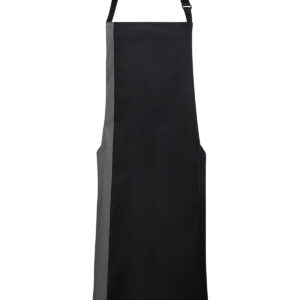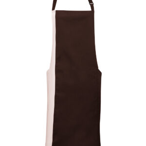 Classic Premier bib apron with contrast coloured panel. Self fabric neck. Self fabric ties 90cm long, width 72cm, length 86cm. 60°C domestic wash. Sliding adjusting buckle. Two front side pockets with slanted opening.