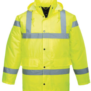 EN ISO 20471 Class 3, EN343 Class 3:1, EN342 standard. Two hip pockets with hook and loop fastened flaps. Drawstring hood. Knitted storm cuffs. Taped waterproof seams. Two-way zip front with studded storm flap. Inside pocket. Mobile phone pocket.