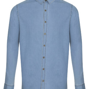 Classic long sleeve light weight denim shirt. Features include front button placket, button detail at cuffs and back yoke. Satin weave. Turned hem with single needle stitch detail. Fashion fit. Single needle contrast at armholes collar and front placket. 2 button placket at cuff. Button placket centre front fastening. Modern narrow collar. Yoke at back shoulder. No pockets for maximum embellishment area.