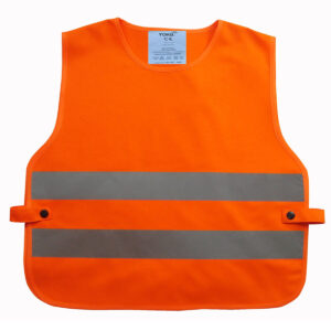 Conforms to EN150:1999. 100% polyester fabric with side elastication and press button. Two 50 mm width reflective tape around the body. Large front & rear area for decoration.