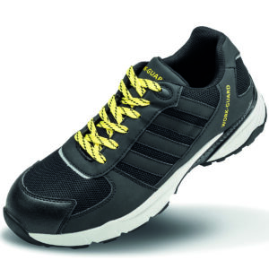 Lightweight SP1 Safety Trainer. EN 20345:2011 S1P SRC. Upper: High Quality PU with Durable Mesh. Toe Guard: Rubber. Toe Cap: Composite. Mid Sole: Composite. Outer Sole: EVA/Rubber. Laces Yellow/Black. Spare laces: Grey/Yellow and Black/Grey.