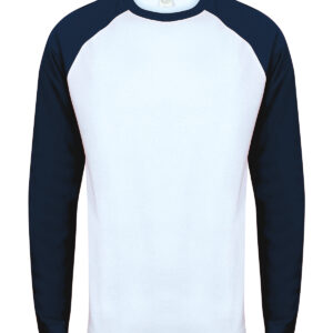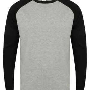 Tear-out SF (Skinnifit) label. Contrast raglan sleeve and ribbed neck with back-neck tape. Long-line. Twin-needle curved hem. Matches Ladies' SK271 and Kids' SM271 Long Sleeved Baseball T's. SEDEX certified. Oeko-Tex certified. BSCI certified. Vegan certified.