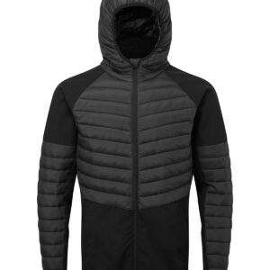 Hybrid jacket with diagonal quilted upper chest and full back. Lower jacket is shell fabric. Full zip-through style with panelled hood. Hood is elasticated for a snug fit. Front pockets. Elasticated hem. Quilted detailing to arms with lower arm in shell fabric. Internal storm flap with zip guard. We recommend using block out vinyl and inks.Product contains no branded neck or waist label. Removable Kimble or looped garment tags. Inner seam label holds important product information on one label with a second label containing brand information which can be cut-away.
