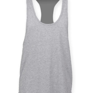 Tear-out SF (Skinnifit) label. Muscle-cut racer-back. Long-line. Self-fabric binding around neckline and armhole. Twin needle straight hem. SEDEX certified. Oeko-Tex certified. BSCI certified. Vegan certified.