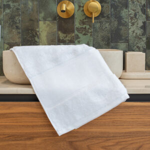 Luxury, heavyweight, organic cotton hand towel with 11cm border area for easy decoration. Dobby design, beautifully soft hand feel and highly absorbent, with hanging loop.