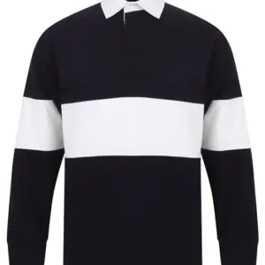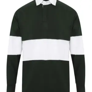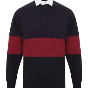 Tag free retro fit rugby shirt. Cut and sew contrast stripe panel around centre. Heavyweight single Jersey. Contrast traditional woven (twill) rugby collar. Herringbone back neck tape. Contrast herringbone taped side vents. Taped shoulders. Elastane reinforced ribbed cuffs for shape retention. Twin-needle hem. Topstitching at armholes and panels. Concealed button placket. Herringbone inner placket. 2 x rubber buttons.