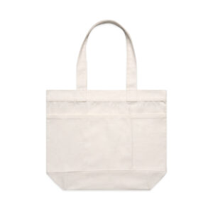 Introducing the Pocket Tote Bag, made from heavy-weight 320 GSM 100% cotton canvas. It features reinforced straps, a large main compartment, and three external pockets.