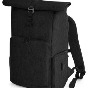 TearAway label for ease of rebranding. Laptop compatible up to 15.6". External access padded laptop compartment. Secure roll-top and clip closure system. Discrete zippered back panel pocket. Front pocket organiser section. Internal slip pocket. Multiple internal pockets. Power bank pocket. Integrated USB charging port. Zippered front pocket. Zippered side bottle pocket. Ergonomic padded back panel. Padded adjustable shoulder straps. Reach certified.