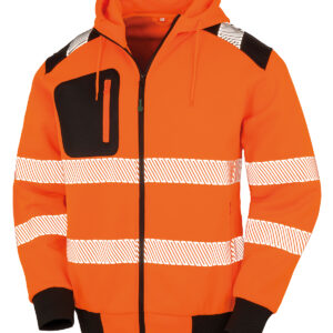 Hoody with heavy stretch rib cuffs and waistband. Easy-stretch, printed safety bands. Full front YKK zip and puller. Zipped front and chest pockets. Warm bushed fleece inner. Hood with drawcord. Hang loop. Recycled REPREVE? performance recycled fabric using environmentally friendly materials made from recycled plastic bottles and post-industrial waste offering a sustainable equivalent to conventional yarns. End of life recyclable: ideal for Corporate Sustainable Responsibility. EN ISO 20471: 2013 + A1:2016 Class 2 / Ris-3279-Tom Class 2 (orange only). Oeko-Tex certified.