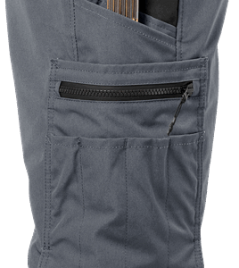 4-way stretch panels at back, sides, crotch and knees / Water repellent / D-ring at waistband / 2 front pockets / 2 back pockets with water-repellent zip / 2 leg pockets with folding rule pocket and pocket with water-repellent zip. One with pen pockets, the other with mobile phone pocket with flap and velcro fastening and pen pockets / Adjustable leg length with 5 cm hem allowance / OEKO-TEX® certified.