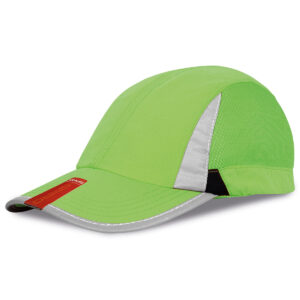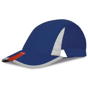 This is a feather weight sport cap in a low profile jockey style quick drying in a non crease sports fabric. Reflective detail to peak and crown. Tear release fabric size adjuster.