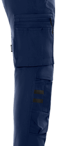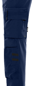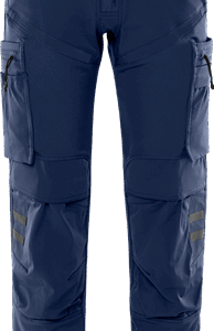 Lightweight 4-way stretch fabric / Durable ripstop 4-way stretch panels at upper front and back / Elastic waist at sides / Concealed front button / 2 front pockets / 2 back pockets with zip / Double reinforced crotch seam / Leg pocket with snap fastening and inside loop for folding rule, zip pocket, pen pocket and 2 tool pockets / Leg pocket with snap fastening, pocket with zip, mobile phone pocket and ID card pocket with flap, D-ring under flap / Ripstop stretch knee pockets with outside opening from above with velcro fastening / Height adjustment for knee pads in knee pockets / Reflective details at knees and leg ends / Ripstop reinforced back of leg ends / Approved according to EN 14404 together with kneepads 124292 / OEKO-TEX® certified.