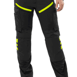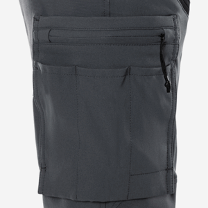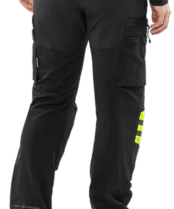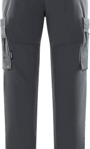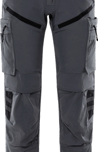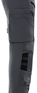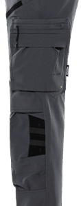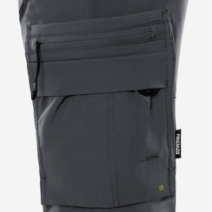 Lightweight 4-way stretch fabric / Durable ripstop 4-way stretch panels at upper front and back / Elastic waist at sides / Concealed front button / 2 front pockets / 2 back pockets with zip / Double reinforced crotch seam / Leg pocket with snap fastening and inside loop for folding rule, zip pocket, pen pocket and 2 tool pockets / Leg pocket with snap fastening, pocket with zip, mobile phone pocket and ID card pocket with flap, D-ring under flap / Ripstop stretch knee pockets with outside opening from above with velcro fastening / Height adjustment for knee pads in knee pockets / Reflective details at knees and leg ends / Ripstop reinforced back of leg ends / Approved according to EN 14404 together with kneepads 124292 / OEKO-TEX® certified.