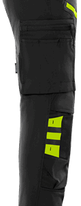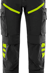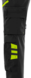 Lightweight 4-way stretch fabric / Durable ripstop 4-way stretch panels at upper front and back / Elastic waist at sides / Concealed front button / 2 front pockets / 2 back pockets with zip / Double reinforced crotch seam / Leg pocket with snap fastening and inside loop for folding rule, zip pocket, pen pocket and 2 tool pockets / Leg pocket with snap fastening, pocket with zip, mobile phone pocket and ID card pocket with flap, D-ring under flap / Ripstop stretch knee pockets with outside opening from above with velcro fastening / Height adjustment for knee pads in knee pockets / Reflective details at knees and leg ends / Ripstop reinforced back of leg ends / Approved according to EN 14404 together with kneepads 124292 / OEKO-TEX® certified.